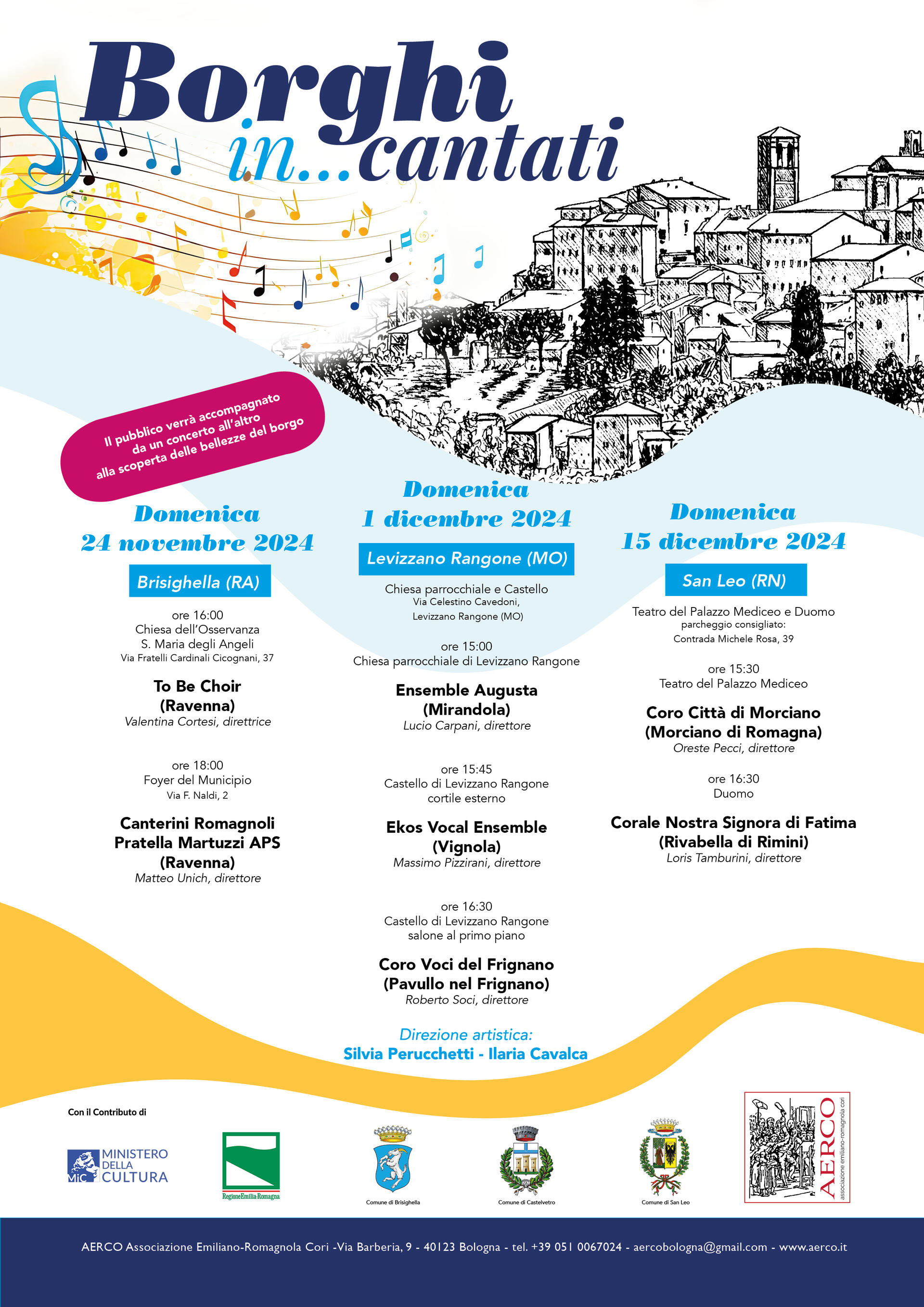Il Festival Corale “Borghi in...cantati” rappresenta un'iniziativa innovativa e coinvolgente promossa da AERCO Associazione Emiliano-Romagnola Cori, volta a valorizzare e celebrare la bellezza e l'identità culturale dei piccoli paesi della Regione Emilia-Romagna.